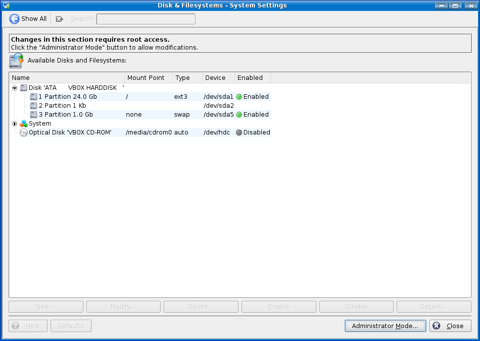 System Settings » Disk & Filesystems in Kubuntu 6.06 (KDE 3.5.2) task manager