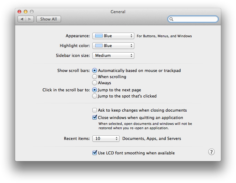 System Preferences » General in Mac OS X 10.9 Mavericks desktop