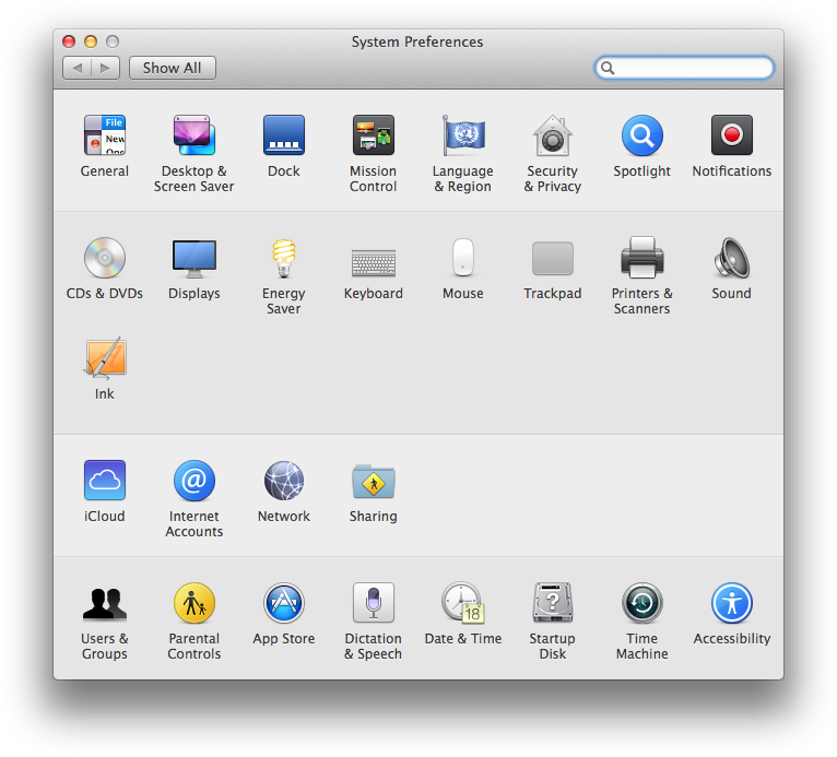System Preferences in Mac OS X 10.9 Mavericks. see system settings section for individual pages help